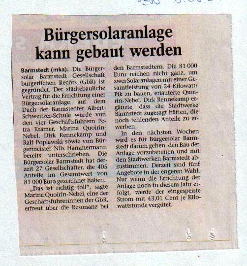 Elmshorner Nachrichten 13.08.2009 - Bürgersolaranlage kann gebaut werden